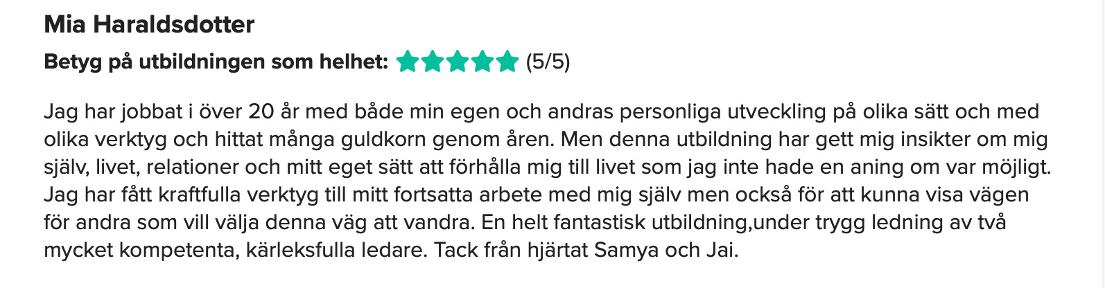 Din kursledare under utbildningen är Samya Thornell som sedan mer än 20 år tillbaka driver Love it tillsammans med sin man Jai Thornell. Samya är verksam som coach och terapeut inom olika specialområden.